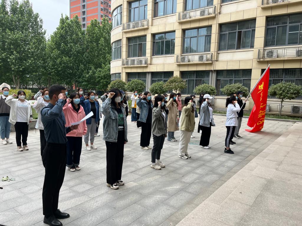 宣誓仪式由王霖喆领誓,团员们面对着团旗,庄严肃穆地诵读出字字千钧的誓词,声音发自肺腑铿锵有力,抒发了对战胜疫情的决心。宣誓后,张红林老师代表团组织对他们提出了希望,要求他们继续加强政治理论学习,恪守在团旗下的诺言,更加严格要求自己,服务学院疫情防控工作大局。刘彦明老师也发表了寄语,感谢同学们愿意为大家牺牲个人休息时间,也期待大家能在疫情防控阻击战中展示出个人独特的风采。